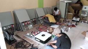 Proses perakitan mencakup pemasangan empat unit MPPT controller inverter 5 kW, serta busbar tembaga berarus tinggi.