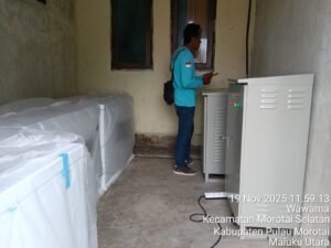 Pada tanggal 19 November 2025, tim melanjutkan rangkaian pekerjaan pengembangan infrastruktur energi terbarukan di Morotai dengan sejumlah aktivitas penting di lapangan. Kegiatan diawali dengan running load sistem PLTS 3 kWp di Desa Wawama yang terpasang di area BUMDes, sekaligus dilakukan pemasangan banner informasi sebagai penanda proyek. Selanjutnya, tim menemukan kendala berupa ketersediaan holesaw untuk box baterai 1 kWp; alat tersebut telah dicari di seluruh wilayah Morotai namun tidak tersedia, sehingga proses pemasangan harus menunggu pengadaan berikutnya.